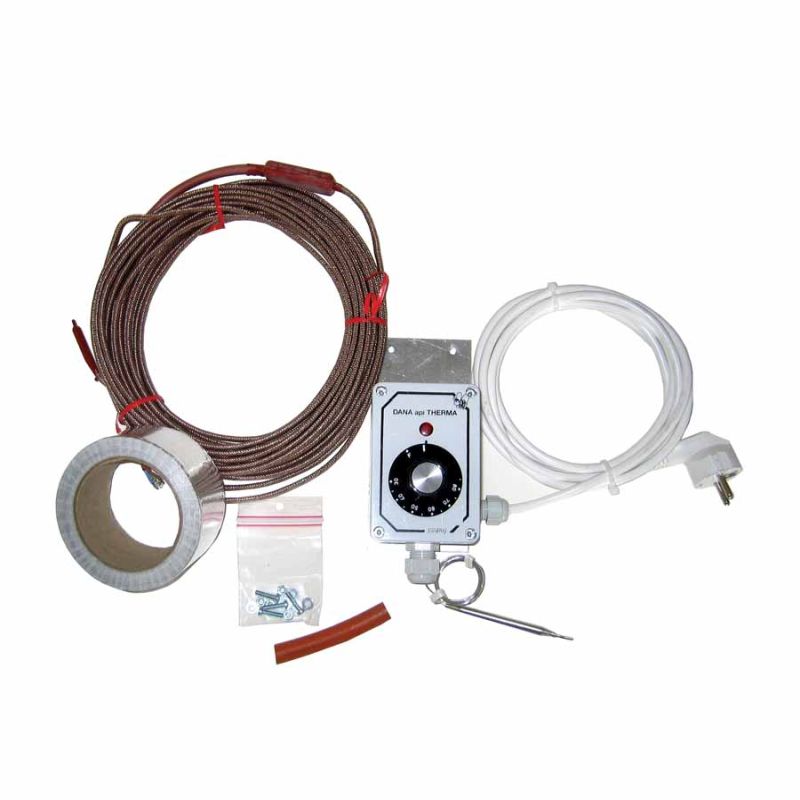 - Contenido del kit: cable calefactor de 17,5 m, caja de conexiones con sonda de temperatura, termostato regulable, cinta de aluminio autoadhesiva, instrucciones detalladas