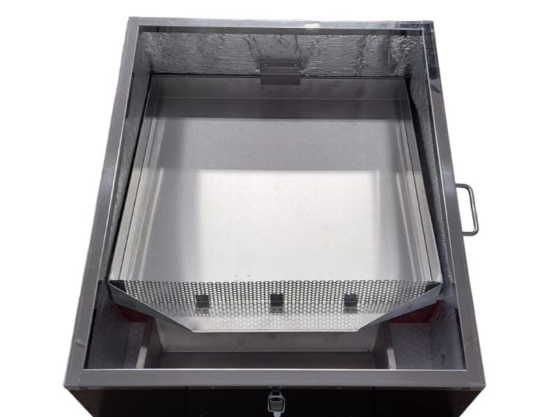 La placa interior extraíble mide 50 x 50 x 6 cm. La cera fundida fluye a través de la placa perforada hacia un depósito de cera con las dimensiones 37 x 11,5 x 6 cm.