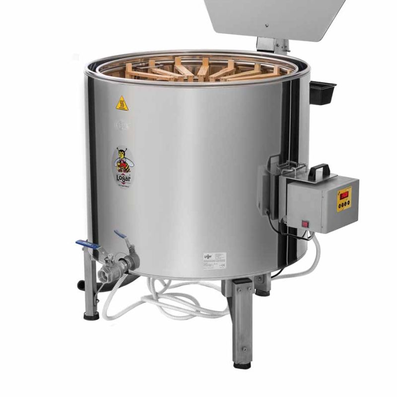 Una robusta centrífuga de cera de Logar que permite fundir rápida y eficazmente panales viejos, panales recortados, cera de opérculos o bloques de cera mediante centrifugado con vapor.