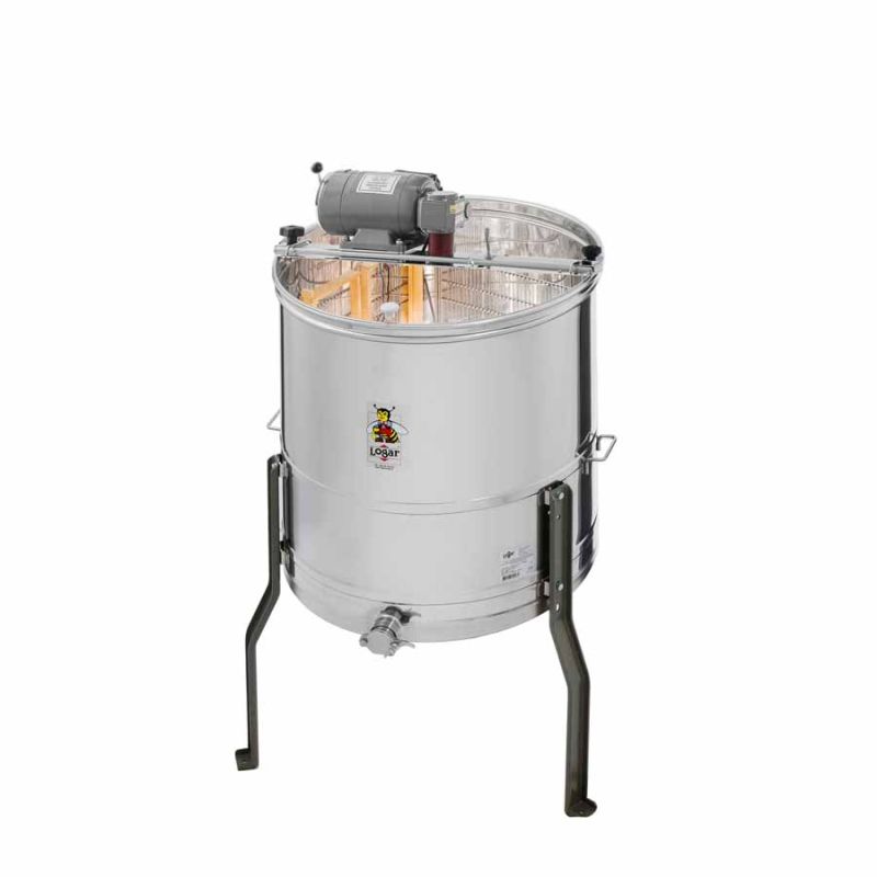 Extractor de miel tangencial para 4 cuadros, universal, con accionamiento por motor 110 W / 230 V y un interruptor de seguridad integrado que apaga el motor automáticamente al abrir la tapa. La tecnología más moderna nos ha permitido desarrollar de forma innovadora el fondo del extractor. El fondo del tambor está soldado sin costuras y tiene pendiente hacia la salida. El grifo exprimidor inoxidable está soldado en el punto más bajo posible para permitir que toda la miel salga del extractor. Todas las piezas que entran en contacto con la miel están fabricadas con materiales aptos para uso alimentario. La tapa se fija con bisagras especiales y está hecha de acrílico transparente, lo que permite observar el proceso de extracción. La construcción especial de las patas garantiza una estabilidad fiable del extractor.