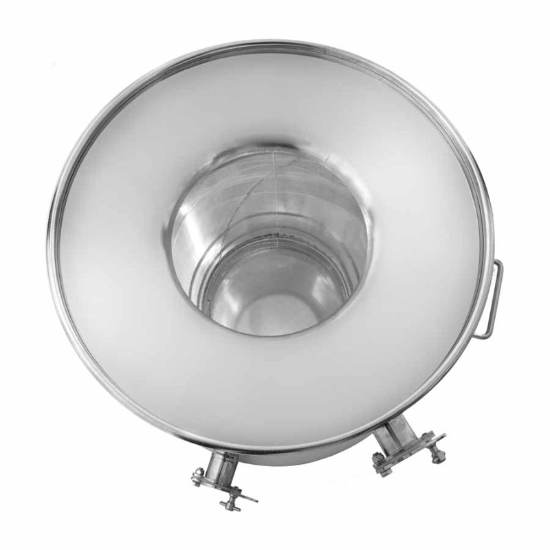 La cuba coladora está especialmente diseñada para el filtrado durante el centrifugado. Dos grifos de pinza de acero inoxidable soldados (superior e inferior) permiten el flujo continuo de miel filtrada y un colado prácticamente ininterrumpido. La malla fina inoxidable para miel (MESCH 26, abertura 0,71 mm) tiene gran capacidad y un anillo antigoteo. Los restos de cera suben a la superficie y pueden retirarse fácilmente; la malla no se obstruye incluso con uso continuado durante todo el día. Al final, la cuba se vacía por el grifo inferior.
