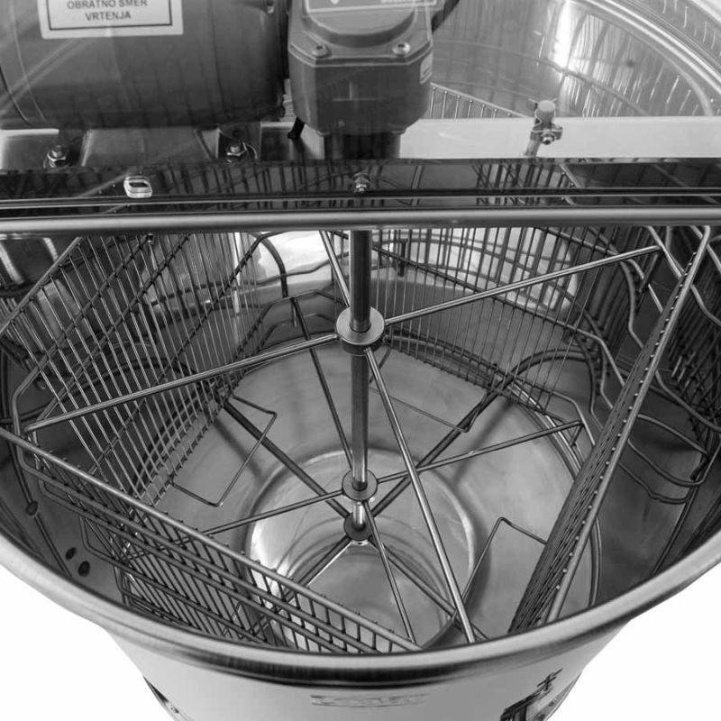Este extractor tangencial de 4 cuadros cuenta con accionamiento por motor (110 W/230 V) con interruptor de seguridad integrado que apaga el motor automáticamente al abrir la tapa. El extractor está diseñado sin base y se coloca directamente sobre la cuba coladora, fijándose con un anillo de tensión, lo que evita vuelcos y aumenta la estabilidad al centrifugar. La miel centrifugada fluye directamente hacia la cuba coladora situada debajo.