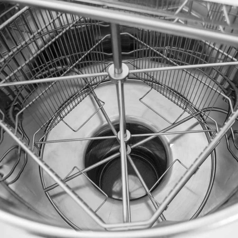La limpieza del extractor de miel es sencilla. Todas las piezas en contacto con la miel están fabricadas con materiales aptos para uso alimentario. La tapa va montada con bisagras y es de metacrilato transparente, lo que permite observar el proceso de centrifugado.