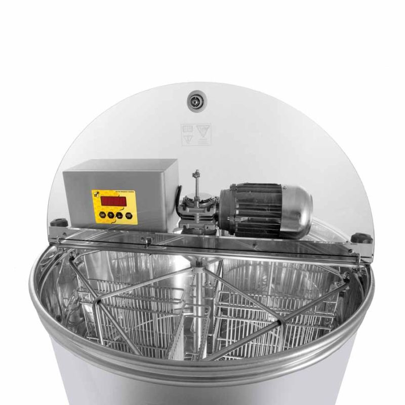Extractor de volteo automático para 4 marcos con motor 110 W / 230 V, control totalmente automático y interruptor de seguridad que apaga el motor automáticamente al abrir la tapa. La tecnología más avanzada nos ha permitido desarrollar de forma innovadora el fondo del extractor. El fondo del recipiente está soldado sin juntas y tiene inclinación hacia la salida. El grifo de compresión inoxidable está soldado en el punto más bajo posible para que toda la miel pueda salir del extractor. Todas las piezas que entran en contacto con la miel están fabricadas con materiales aptos para uso alimentario. La tapa es de acrílico transparente. Una construcción especial de las patas garantiza una gran estabilidad.