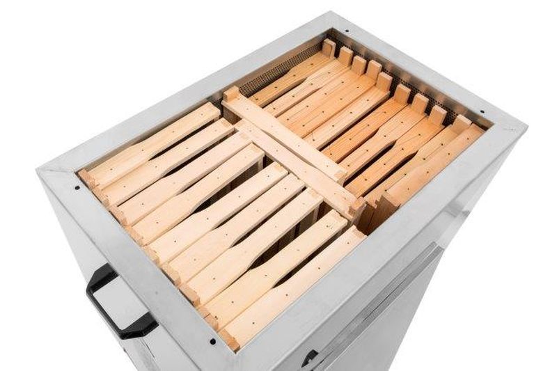 Adecuado para: Apicultores con 20–100 colmenas. Capacidad: aprox. 23 marcos (la cantidad depende del tamaño de los marcos). Dimensiones de la cesta: 33 × 53 × 49 cm. Dimensiones totales: 41 × 61 × 85 cm (incl. soporte desmontable).