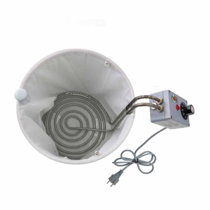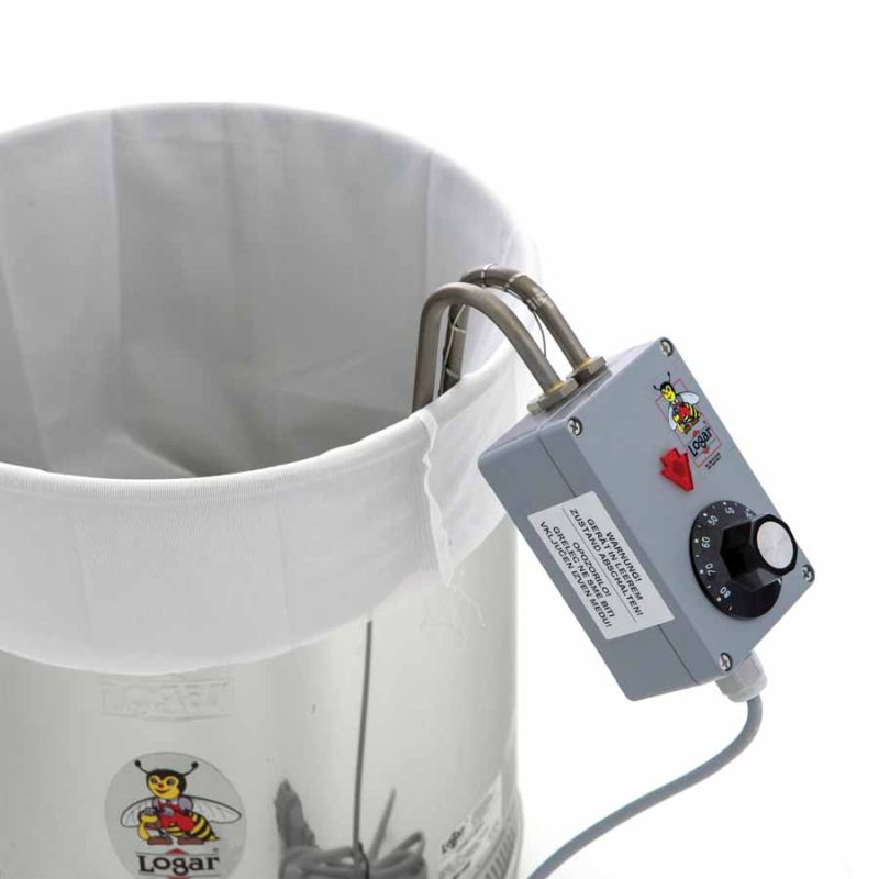 Coloque un recipiente colector adecuado (Ø interior 30,6–30,8 cm) bajo el Honeytherm. Recomendamos utilizar los recipientes de envasado Logar con diámetro interior de 30,7 cm (35, 50 kg). Introduzca la bolsa filtrante en el decantador, fíjela por el borde y coloque la espiral calefactora en su interior. Añada la miel de manera que la espiral inferior quede completamente cubierta. Solo entonces ajuste la temperatura en el termostato a aprox. 65 °C.
