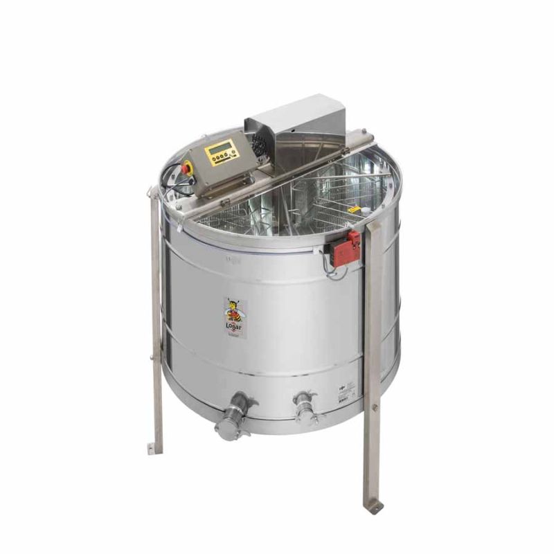 Centrífuga de volteo automático para 8 cuadros de Logar, equipada con motor 370 W / 230 V, control totalmente automático y dispositivo de seguridad integrado que apaga el motor automáticamente al abrir la tapa. La tecnología más moderna permite una ejecución innovadora del fondo de la centrífuga: soldado sin juntas e inclinado hacia la salida. La centrifugadora dispone de dos grifos de miel inox (grifos de pinza 6/4'' y 2''); el grifo de 2'' está instalado en el punto más bajo para permitir el vaciado completo de la miel. Todas las piezas en contacto con la miel están fabricadas con materiales aptos para uso alimentario. La tapa es de acrílico transparente.