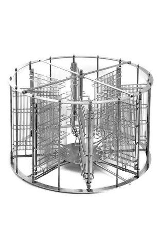 Las bandejas porta-cuadros se fabrican con varillas enrejadas verticales de densidad adecuada para evitar que los marcos sufran daños durante el centrifugado. Están conectadas entre sí mediante un mecanismo especial. Las bandejas evitan la acumulación de miel en los compartimentos, por lo que los marcos quedan secos después del centrifugado. Bajo suplemento, se pueden suministrar bandejas para marcos de hasta 28 cm de altura.