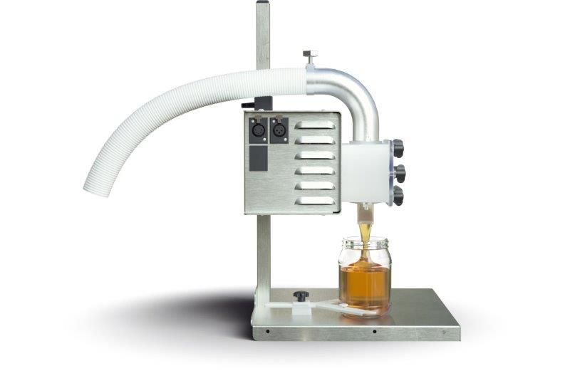 La máquina llena miel líquida y recién extraída a temperaturas de 20–25°C. La miel muy cremosa con bajo contenido de agua debe calentarse a esta temperatura para garantizar un proceso de llenado rápido y sin problemas. Esta envasadora permite dosificaciones precisas y eficaces y es de fácil limpieza.La miel se aspira desde un depósito de cualquier tamaño mediante una manguera suministrada y una válvula antirretorno, y se dosifica directamente en el tarro de miel sin goteo. Se suministran varias boquillas de llenado que se eligen según el diámetro del tarro y la viscosidad de la miel.